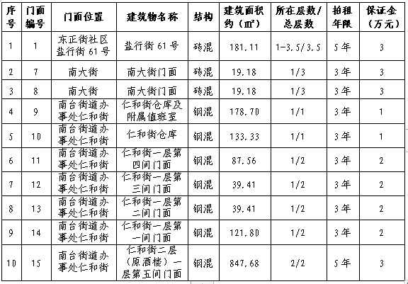 拍租10個(gè)國有門面使用權(quán),詳見下表: